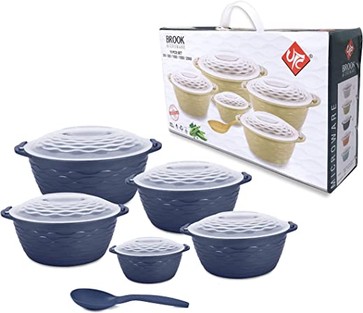 “طقم اواني ميكروويف بروك من 10 قطع وملعقة لتقديم الطعام من يو تي سي، ازرق، بولي بروبلين بكر 100%، صنع في الهند “